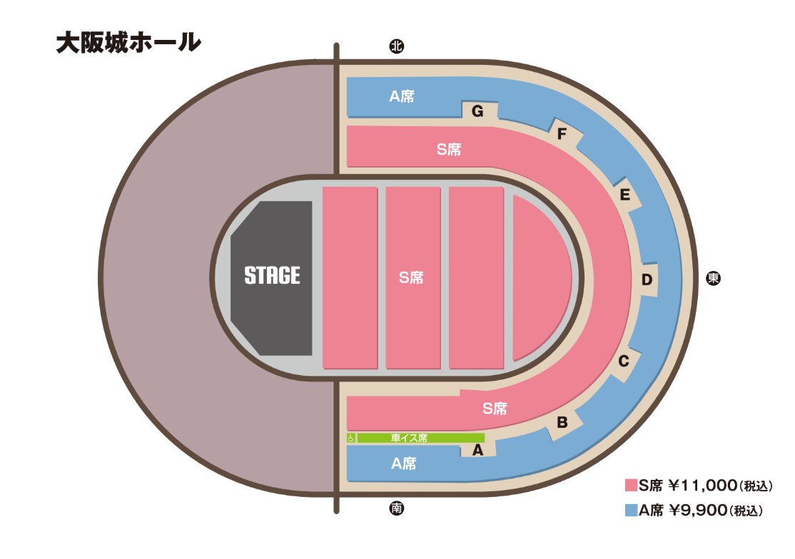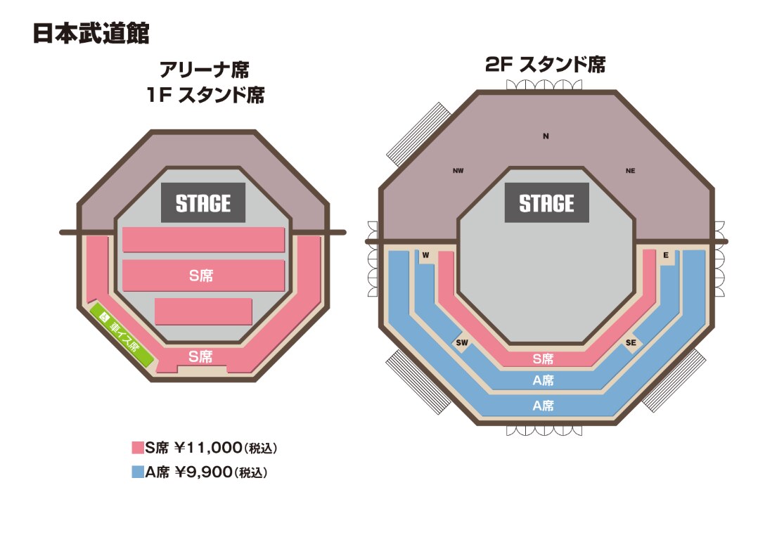 絡をお願いいたします。アリーナ公演(日本武道館、大阪城ホール)の車椅子席はS席の位置になりますので、S席のチケットをお買い求めくださいますようお願いいたします。