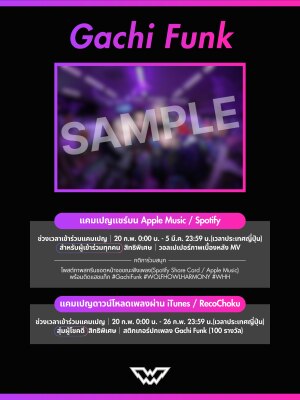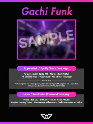 https://forms.gle/DrbEbKm5uHKs9oL38 ③ 特典配布:確認後に順次送付いたします iTunes / RecoChoku Download Campaign (Feb 20, 12:00 AM – Feb 26, 11:59 PM) Prize (Random Drawing): 100 winners will receive a Gachi Funk cover art sticker แคมเปญดาวน์โหลดเพลงผ่าน iTunes / RecoChoku(20 ก.พ. 0:00 น. - 26 ก.พ. 23:59 น.) สิทธิพิเศษ (สุ่มผู้โชคดี): สติกเกอร์ปกเพลง Gachi Funk (100 รางวัล) ぜひ、各DSPから「Gachi Funk」をお楽しみください。