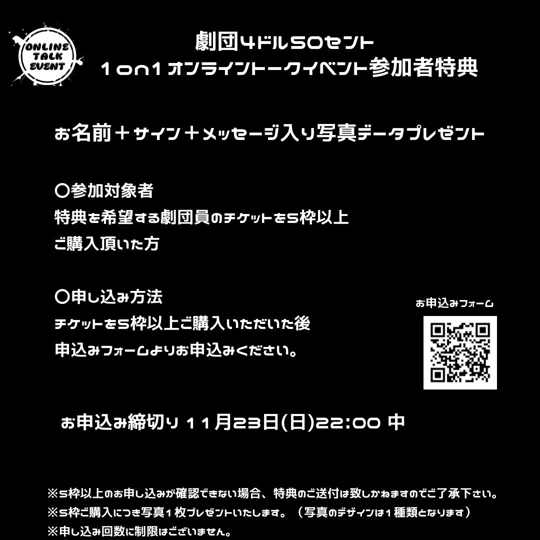 劇団4ドル50セント「1on1オンラインイベント 」 のチケットを【5枠以上】ご購入頂いた方に、 お名前+サイン+メッセージ入り写真データ(1種類)をプレゼントいたします!