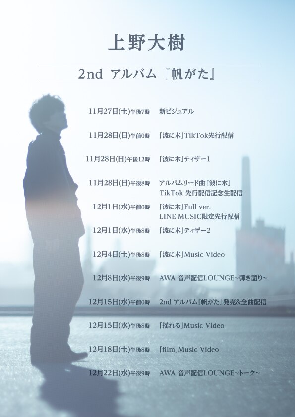 上野大樹、最新アルバム『帆がた』のプロモーションスケジュールを発表!