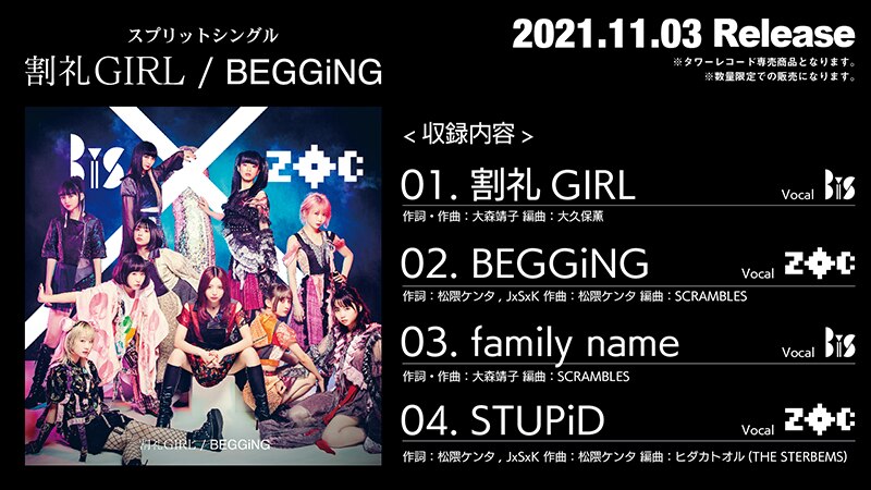 11月3日発売となるBiS×ZOCスプリットシングル「割礼GIRL/BEGGiNG」のジャケット写真と購入者特典が公開!
