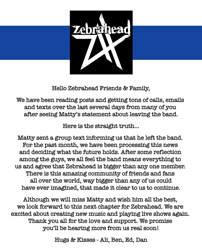 ゼブラへッドからマッティ・ルイス(Vo, G)が脱退。バンドは新たなステージにむけて活動継続。2022年には今年延期になった日本ツアーも予定。