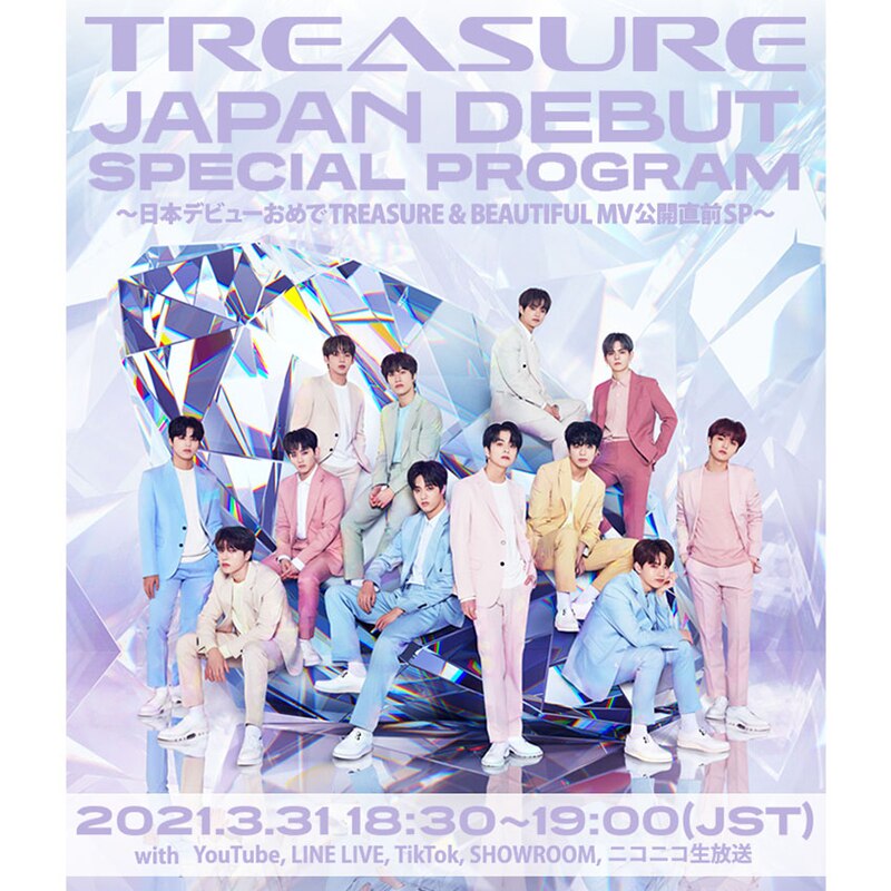 3/31(水)日本デビューに先駆けた先行配信曲がLINE MUSICウィークリー2週連続1位獲得中の大型新人"TREASURE"、日本デビューを記念した特番「日本デビューおめでTREASURE & BEAUTIFUL MV公開直前SP」が全8チャンネルで3/31(水)18:30~配信決定!!