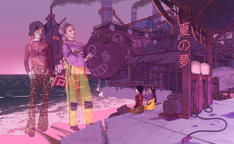 機械仕掛けのラップ・デュオ『FEMM』が、PC MUSICとのコラボで制作した「Peach」のダンスビデオを公開。仮想ディストピア「新東京」でのAR LIVEを可視化したサイバーパンクな映像に。