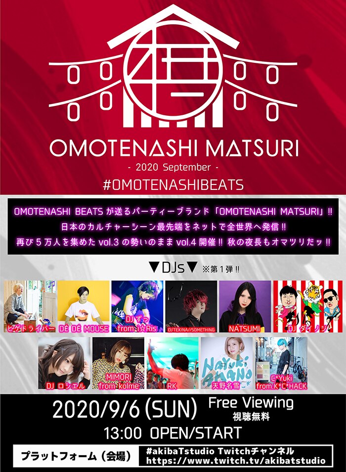 ヒゲドライバー、DÉ DÉ MOUSE、DJ ダイノジ、DJ'TEKINA//SOMETHINGら出演の「OMOTENASHI MATSURI -2020 September-」が 9月6日(日)に視聴無料で開催!!