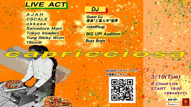 3/10(火)にEBISU BATICAで開催するBIG UP!主催イベント「カプリチョーザ」を無観客イベントとして、WEBライブ・プラットフォーム「MUSER」でのクラウド・ライブを開催する事が決定!