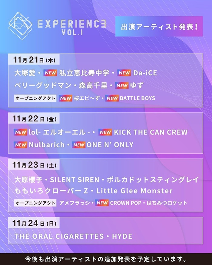 日本初全席ダイナミックプライシングの音楽イベント”EXPERIENCE VOL.1”追加出演アーティストにKICK THE CAN CREW、私立恵比寿中学、Da-iCE、ゆず など10組が決定!またチケット先着販売スタート!