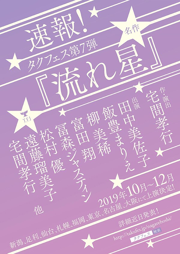 タクフェス第7弾『流れ星』柳 美稀、富田 翔、冨森ジャスティン、松村 優、遠藤瑠美子ら出演者第二弾発表!