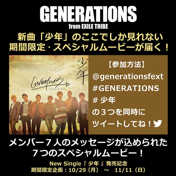 GENERATIONSニューシングル「少年」のスペシャルムービーが見られる 期間限定Twitterキャンペーン実施!