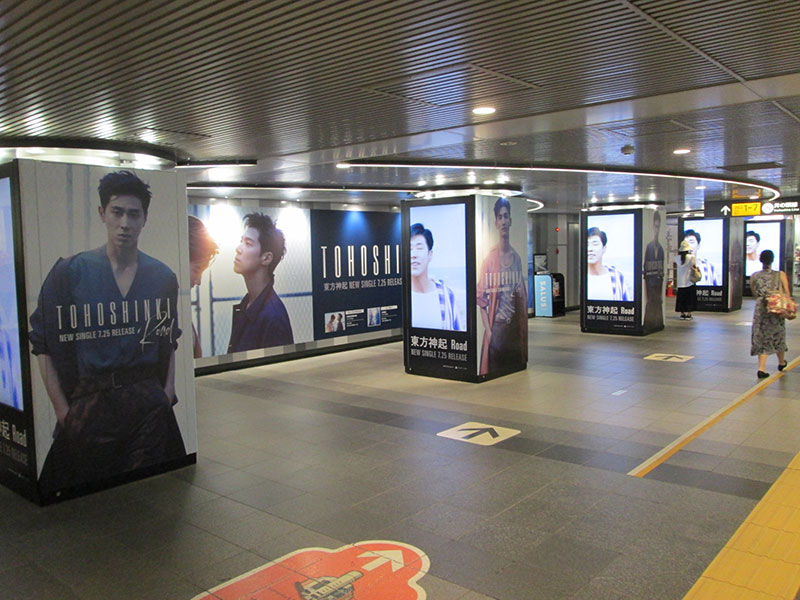 左右両面に東方神起の巨大ビジュアルが連なり、中央にはビジュアルでラッピングされたサイネージに「Road」の映像が流れている。ジャックされた東方神起Roadの光景はまさに圧巻で今後ファンが殺到するに違いない。
