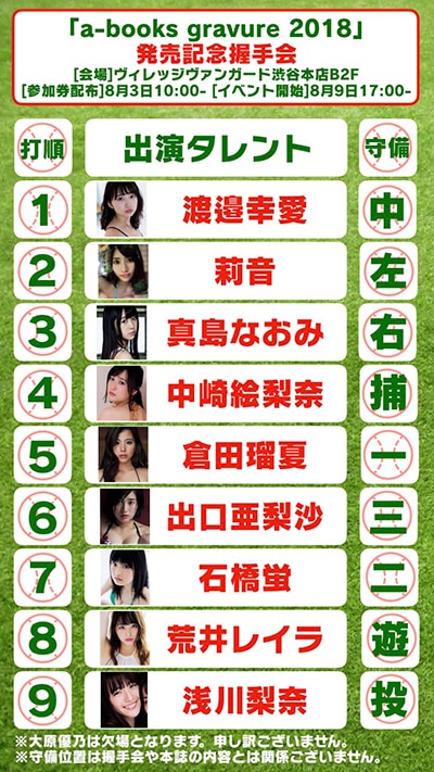 「a-books gravure 2018」には浅川梨奈・大原優乃のほかにも、巨乳過ぎるレポーターとしてグラビアに登場し舞台『おそ松さん』ではトト子を熱演している出口亜梨沙、2年ぶりのグラビアでショートパンツ姿披露の荒井レイラ、保育士の資格を取得しグラビアやDJ活動を行っている元アイドリング!!!の倉田瑠夏、ピコ太郎プロデュースのChubbinessで活動しミスヤングチャンピオンにも輝いた中崎絵梨奈、エイベックスグラビアオーディショングランプリに輝いた莉音、注目のドール系女子真島なおみなど10名が出演し、SUPER☆GiRLSからは渡邉幸愛、石橋蛍も参加する。