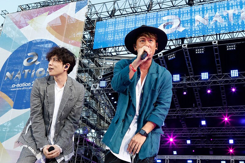 5年の活動休止期間を経て昨年再始動を果たしたCHEMISTRYがa-nationに初参戦。堂珍嘉邦と川畑要という全くタイプの異なる歌声が心地好く溶け合い、美しいハーモニーを届けていく。「PIECES OF A DREAM」や「Point of No Return」など惜しげもなく披露されたヒット曲の数々が、少しずつ陽が傾いてきたスタジアムに涼しい風を届けてくれた。