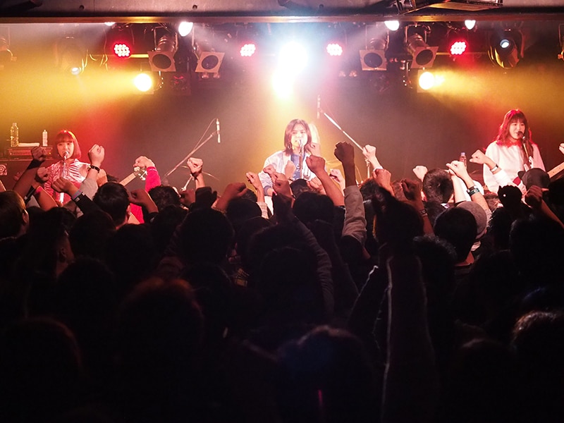 SAKIKA(Vo&Gt)の「上手くいく事ばかりではなくて悔しい思いをしたり、もがき続けながらバンドを続けながらバンドを続けています。でも、この4人で絶対に思い描いた未来を叶えたいと思って本当に沢山の人に協力してもらっています。初心を忘れない様に歌い続けたい曲です」と思いを込めたMC後に披露された「15」では涙する観客も。「Girl's Talk」「JUMP」「キセキラッシュ」等ではその若さと勢い、そしてメンバー自身もLIVEを楽しむ圧巻のパフォーマンスで会場は更にヒートアップ。