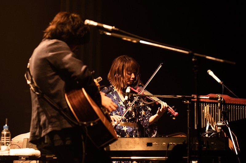 そのクライマックスのひとつが、「意外にもアンケートで一番人気でした」というMCで始まった「Will you?」。快感中枢にくるYUKAのハイトーンと柾のコーラスが讃美歌のように美しいこの曲で、後半サッとバイオリンを抱えたYUKAは、柾が繰り出すアイリッシュな響きに乗って、思うままのフレーズを奏で、ディレイを駆使して洪水系サウンドを即興的に構築したのだ。これが絵画的かつ宇宙的で、凛と弓を滑らせるその姿が本当にカッコく胸を打った。「立っちゃおうか」と始まった今日イチ元気な「Yes」は、柾の独特な奏法とYUKAのaframeのワザとで、オーガニックEDMと呼びたくなるような新境地。聴き入るばかりだった観客も、ここでは堰を切ったように手拍子で盛り上がった。