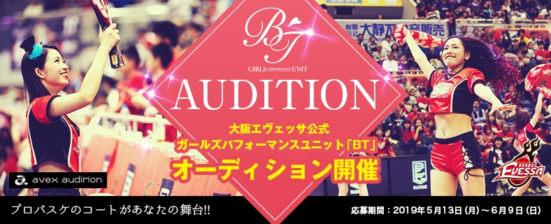その『B.LEAGUE』所属のプロバスケットボールクラブ『大阪エヴェッサ』とエイベックスがタッグを組み公式ガールズパフォーマンスユニット『BT』の新メンバーを選出する『大阪エヴェッサ BT AUDITION 2019』を実施。