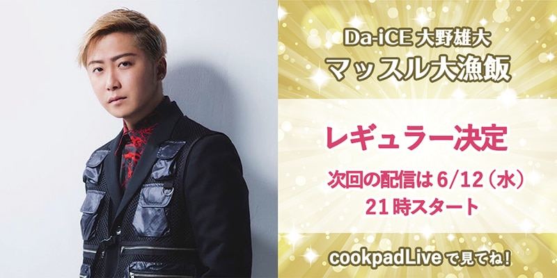 Da-iCEの大野雄大が、クッキングLiveアプリ「cookpadLive」にてレギュラー番組を始めることが決定した。