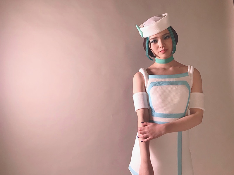 ちょっと不思議な「ミツリちゃん」役として、近未来風の衣装とメイクで、いつものクールビューティーなイメージとは違う姿を披露。