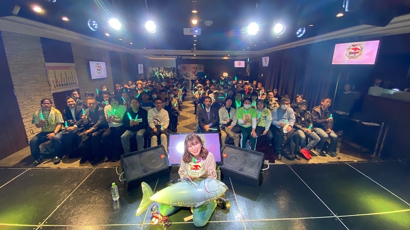 生誕祭が幕を開けメンバーが登場するやいなや、ソーラン節のBGMが流れはじめ、坂林の大好物である “マグロ” と坂林本人の写真が描かれた大きな横断幕が掲げられた。また、この演出の最後には、坂林が釣り竿でマグロ風船を釣り上げる場面も。約3分にもわたった演出は横断幕の作成など含め全て坂林推しのファンたちによってサプライズで行われた。
