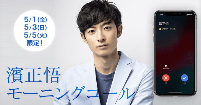モーニングコールの配信日は5/1(金)・5/3(日)・5/5(火)の3日間、無料提供となっておりOKOSアプリ内から登録すると、朝8:00に濱正悟から電話がかかってくる仕組みとなっている。