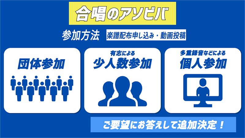 更に、アンケート内でのリクエスト多数により各合唱団体毎の楽譜配布申し込み、動画投稿という制限を外し、学生や社会人など年齢を問わず個人や有志の少人数での楽譜配布申し込み、動画応募も可能となった。