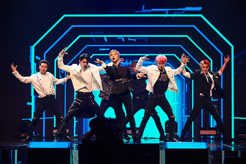 終盤を盛り立てるのは“K-POP界のアベンジャーズ”! 7人による世界照準のボーカリゼーションやダンスは時にスリリング時に妖艶と、瞬きする暇なく息をのむばかり。例えば、口火を切った「Jopping」では7人の声とアクションが絡み合って勢いを増し、続く「Super Car」ではラップを伴いストリート感を濃くし、見る者の鼓動を高鳴らせるという具合。曲ごとに濃密な世界へと誘う。また日本語での挨拶を含むMCを挟んだあとは、「With You」や「Dangerous Woman」で彼らのラフな一面や息の合ったハーモニーも楽しめる時間。当然、画面の前で悶絶するファンが続出しているのは想像に難くない。そして彼らは最終に9/25発表の初のフルアルバム『Super One』にも収録される「100」を選んでゴール。痛快なビートと疾走感を倍増させる小刻みなステップにのせ、前のめりのメッセージを人々の心に残していった。