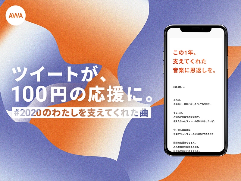 「AWA」がライブエンタメ業界への支援を目的としたチャリティキャンペーンを実施。特設ページから「#2020のわたしを支えてくれた曲」をTwitterへ投稿するとAWAが100円を寄付