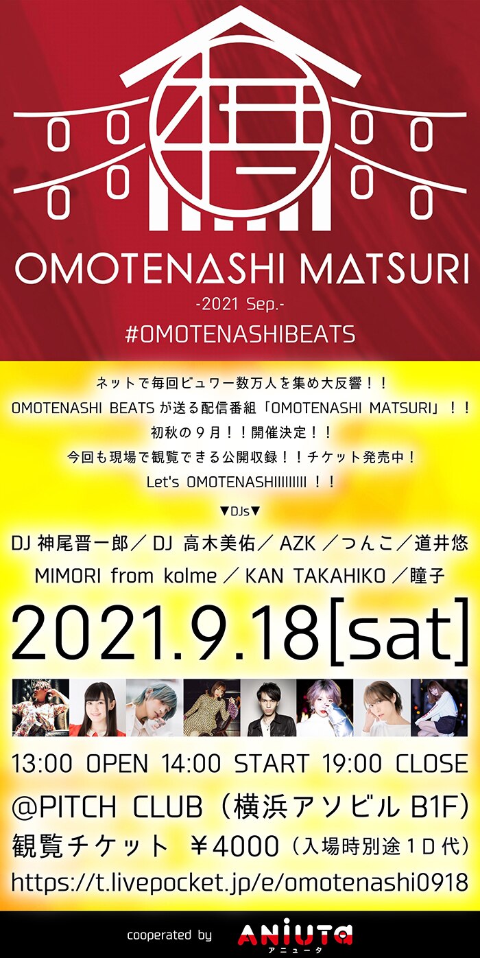 OMOTENASHI MATSURI、9/18開催決定! DJ神尾晋一郎、DJ高木美佑、AZK、つんこらOMOTENASHI MATSURIおなじみの豪華DJ陣が集結!