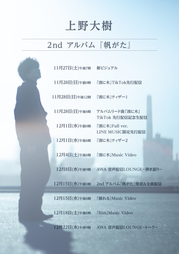 上野大樹が12月15日に発売される最新アルバム『帆がた』のプロモーションスケジュールを発表した。