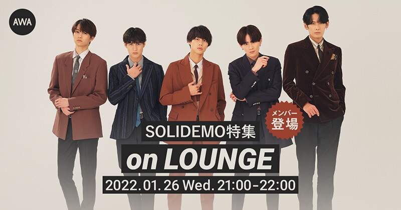 サブスクリプション型(定額制)音楽配信サービス「AWA(アワ)」は、2022年1月26日(水) 21:00~22:00の1時間に渡り、オンライン空間「LOUNGE」で、SOLIDEMOのメンバー登場イベントを開催いたします。