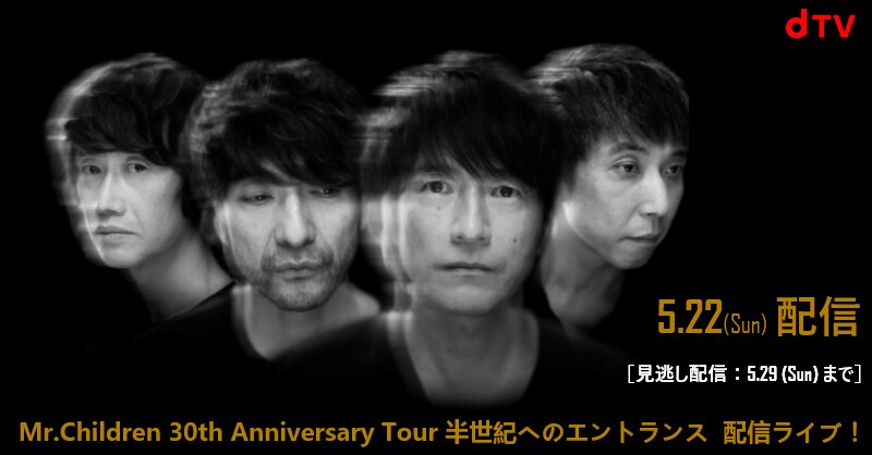映像配信サービス「dTV®」は、Mr.Childrenのメジャーデビュー30周年となる2022年5月10日(火)に東京ドームで開催された「Mr.Children 30th Anniversary Tour 半世紀へのエントランス」を2022年5月22日(日)に配信します。
