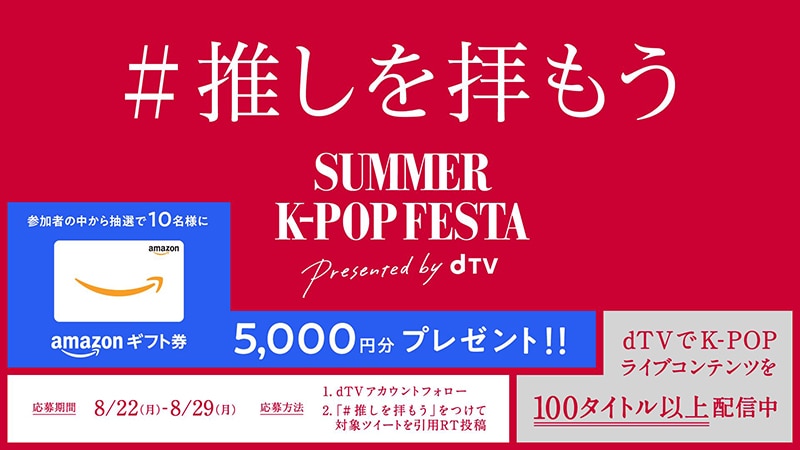 dTV公式 Twitterアカウント(@dTV_PR)をフォローし、対象のキャンペーン投稿を「#推しを拝もう」のハッシュタグをつけて引用RTした方から抽選で10名さまにAmazonギフト券5,000円分をプレゼントします。