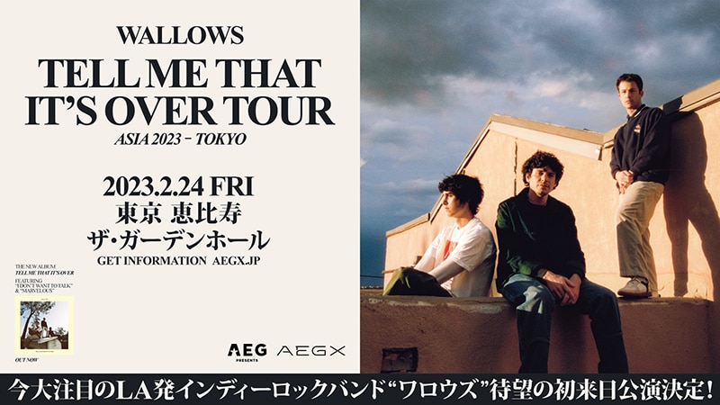 AEGXは、米LAを拠点に活動する3ピースバンド“ワロウズ”の東京公演「WALLOWS TELL ME THAT IT'S OVER ASIA TOUR 2023 TOKYO」を 2023年2月24日(金)東京・恵比寿ザ・ガーデンホールで開催することを発表しました。チケットは11月8日(火)昼12時より最速先行受付(抽選)が開始されます。