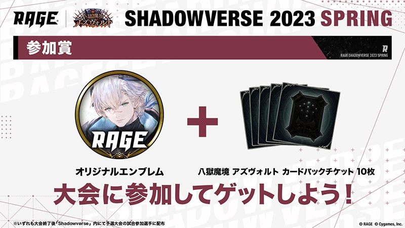 さらに参加賞として全員に「RAGEオリジナルエンブレム」と、「⼋獄魔境アズヴォルトカードパックチケット10枚」が贈られます。