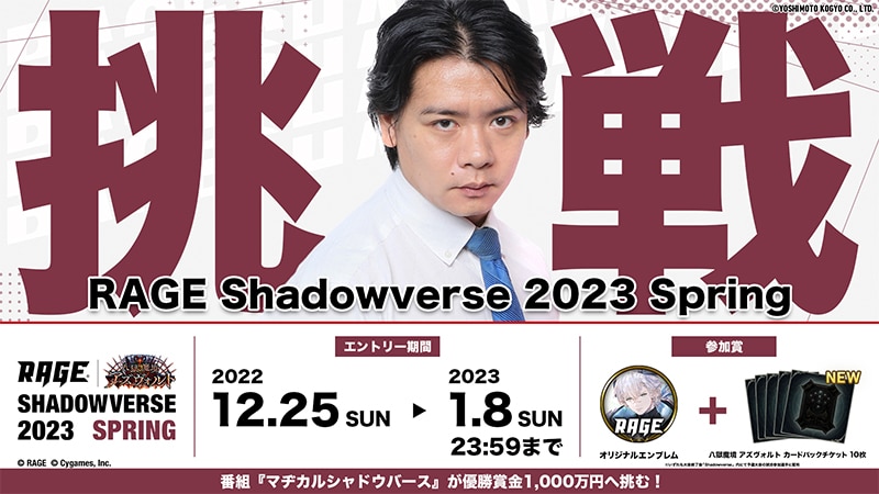 株式会社CyberZ、エイベックス・エンタテインメント株式会社、株式会社テレビ朝⽇が運営する国内最⼤級のeスポーツエンターテインメント「RAGE(レイジ)」は、対戦型オンラインTCG『Shadowverse』の⼤会「RAGE Shadowverse 2023 Spring」を開催することを発表いたしました。
